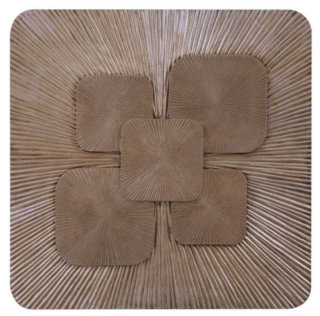 The Crobuzon Wall Art features a rustic modern carved wood panel with a starburst pattern background, where wood pieces mimic the natural form of organic leaves. The design blends earthy elements with a contemporary touch, creating a unique and striking focal point for any space.Read More