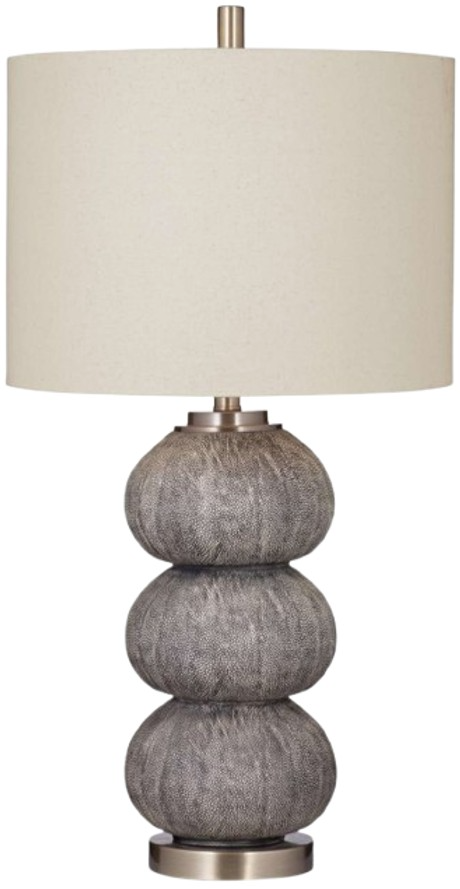 The Jed table lamp is crafted of polyresin in a cream and dark gray finish with a natural linen drum shade. The hand crafted details produced by a skilled artist lends itself to a unique technique and will vary slightly.Read More