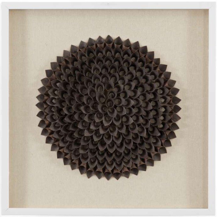 Nature wall art is a shadow box accentuated with a linen-like oatmeal-colored mat and a floral pattern of rolled cutouts of natural fibers and a white modern frame. This piece of art is hand-painted by a skilled artist lending itself to a unique technique and will vary slightly.Read More