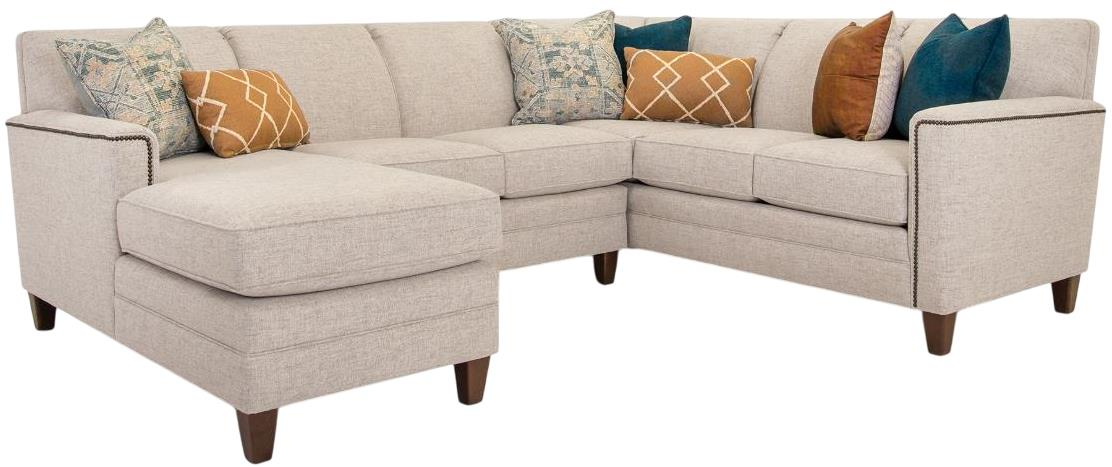 This 3-piece sectional with chaise, built from the build-your-own "Design Your Way" collection, features fabric upholstery and deco arms with an intricate nail head trim. Available in a variety of colors and styles. See local dealer for customizable material options.Read More