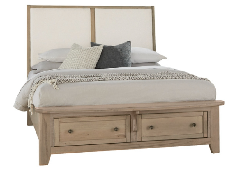 Upholstered bed with footboard storage boast a refined classic look that will stand the test of time. Styled with simple lines; the canted headboard is slightly angled for comfort. Two drawers in the footboard of the bed offer up plenty of convenient storage for extra bedding.Read More